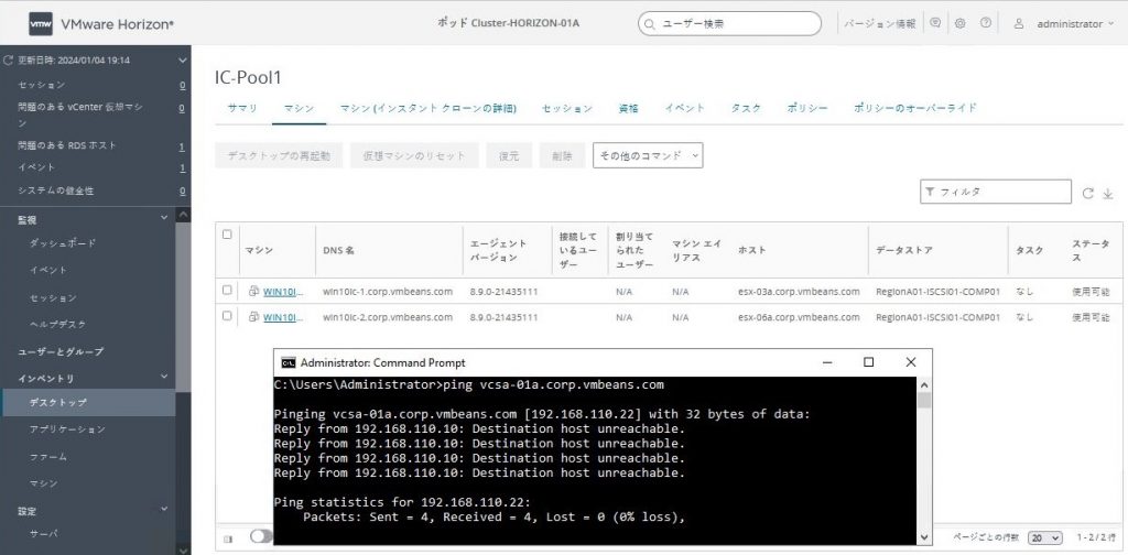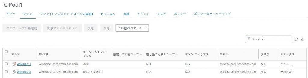 ここまでの検証で、vCSAがシャットダウンしても展開済みの仮想デスクトップに関しては影響がないことがわかりました。