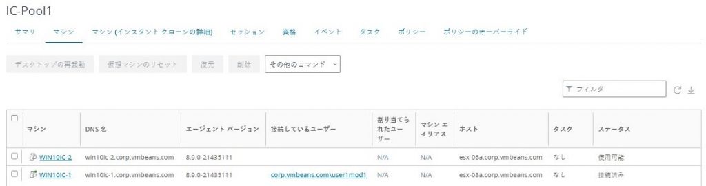 Horizon Console上でも、マシンWin10IC-1のステータスが接続済みとなっています。