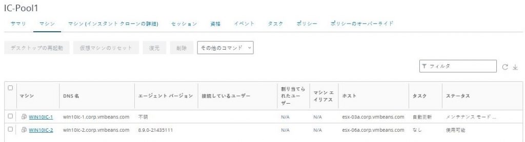 vCSAのシャットダウン後、展開済みの仮想デスクトップのステータスは使用可能のままですので、変化はなく、影響がないことがわかります。