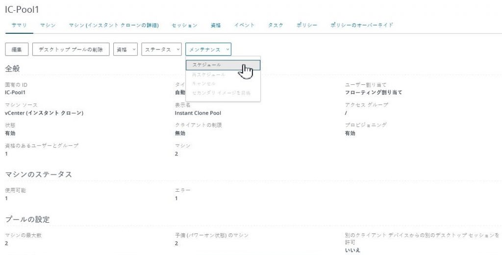 展開されている仮想デスクトップ数は2台です。2台ともステータスは使用可能となっていますので、ユーザが接続できる状態です。